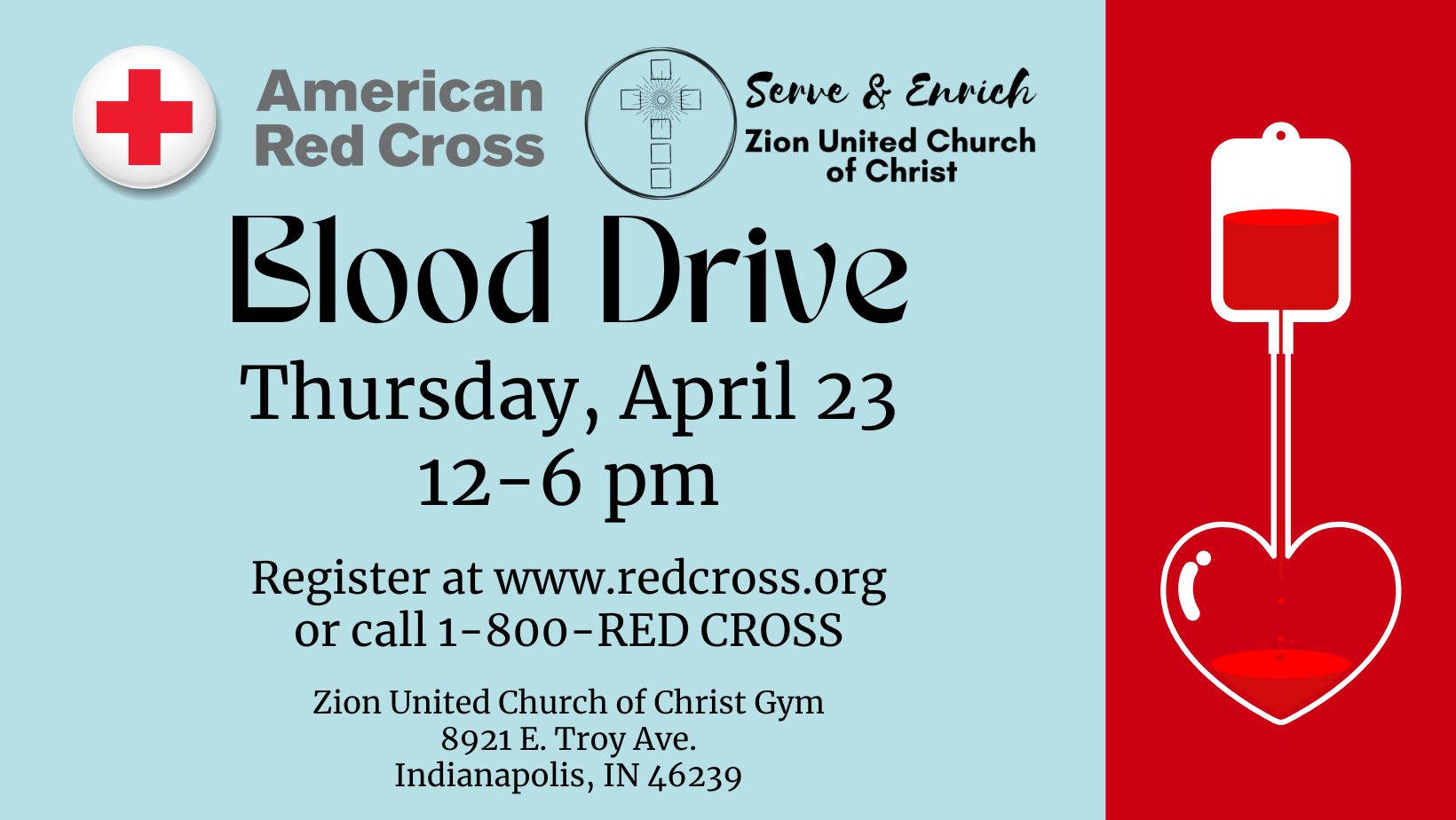 Register for our next blood drive today. Just look for the "Zion Education Building" event through the Red Cross website.